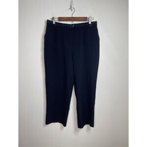 Kim Rogers pants dress slacks women’s size 14p 14 petite navy blue flat front with elastic back for comfort, pull on style with side slash pockets in front and no pockets in back. The material is a medium weight with a little stretch in a straighter leg style.
