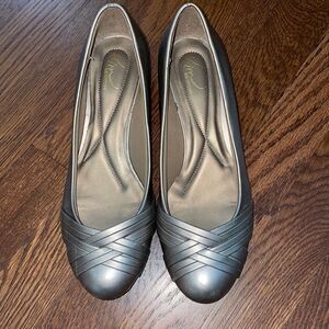 Kim Rogers “Wynne” silvery bronze shoes with slight wedge heels