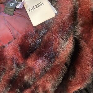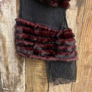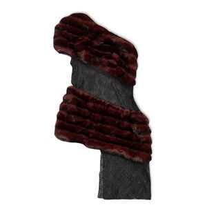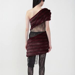 Elegant one-shoulder design. Burgundy fur detail. Black lace accent. Perfect for evening wear.
