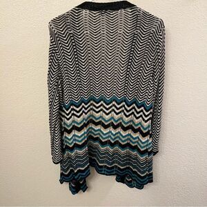 This multi color open cardigan sweater is from Kim Rogers. The material and size label has been removed for comfort. The sweater has a nice soft feel. The measurements are 26” L x 24” W (pit to pit) x 19” sleeve (shoulder to cuff). The cardigan has been gently worn but is in very good condition.