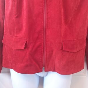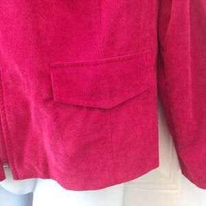 Tim Rogers red zippered front corduroy jacket with pockets, and shoulder pads.