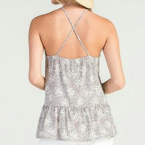 -CROSS-STRAP TOP -FLOWER PRINT -RUFFLED BOTTOM -MADE IN USA 100% POLYESTER -LENGHT: 24" -CHEST:18"