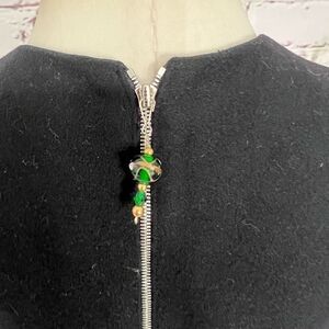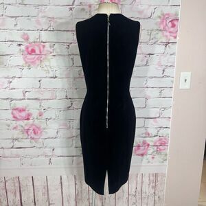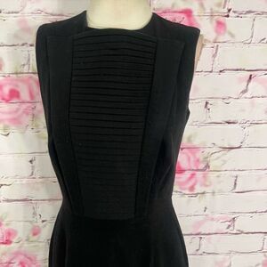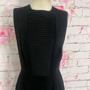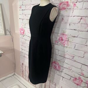Fun flirty and feminine sleek chic classic timeless wool blend black sheath dress with front panel over bust. Rear exposed silver zipper. Great for business professional office work attire or a special event