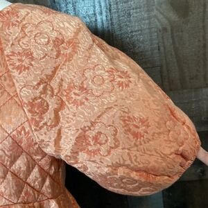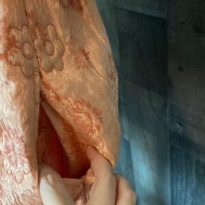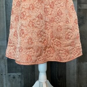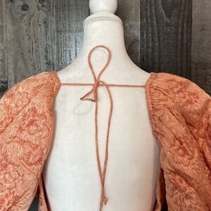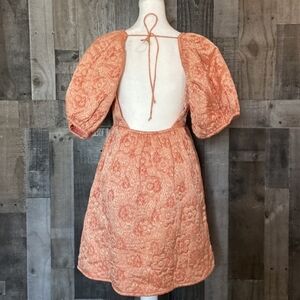 Gorgeous Kimchi Blue Astrid Babydoll dress in a beautiful coral/peach shade with textured floral jacquard pattern throughout. Features stunning puff sleeves, empire waistline, and a mini length for a sweet feminine silhouette. Has side inseam pockets. The open back with tie closure adds a gorgeous breezy detail perfect for spring and summer!