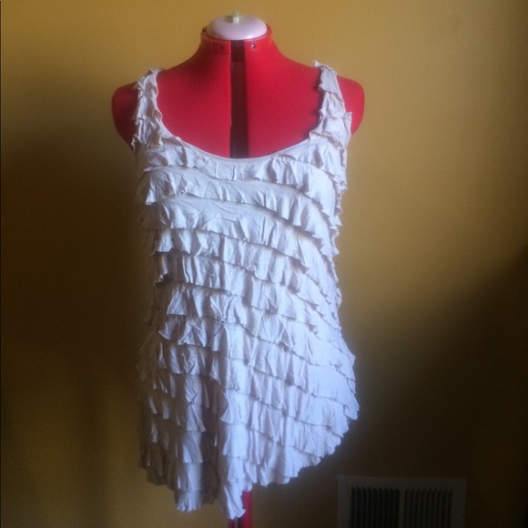 With just the slightest hint of pink, this gorgeous ruffled tank is perfect for layering and mixing textures, or just to simply wear alone on a sunny day. Flattering long length with slight pilling on the back straps.