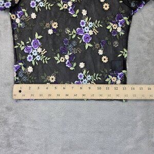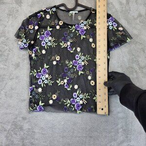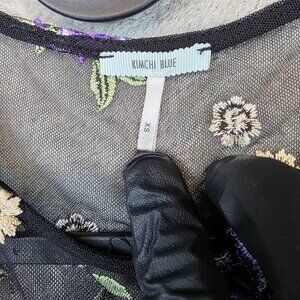 Kimchi Blue Shirt Womens XS Black Mesh Sheer Floral Embroidered Short Sleeve