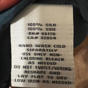 Silk dress with ruffle. Really adorable. It's light weight for summer but dark turquoise blue and perfect for fall. I wore it with tights. Very pretty, dressy enough for cocktail party or can dress down. 100% silk. It's too big on me. Worn once or twice.