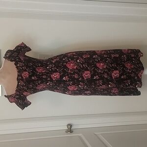Kimchi Blue (Urban Outfitters) Smocked Floral Midi Dress, Size S, EUC! Beautiful Black with Pink Floral Print, Off-Shoulder with Smocked Sleeves and Bodice. Pit to Pit is between 12-13 Unstretched (smocked, so has a lot of stretch), Shoulder to Hem - 39" with a 17" Slit on side. Shown on a size 6 mannequin.