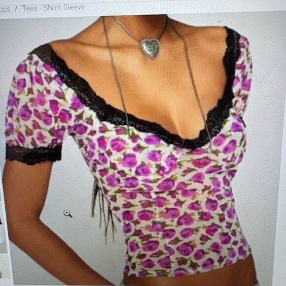 Super cute Kimchi Blue Mesh v-neck top, purple rose print with black lace lining sleeves and collar. Size L, NWOT in excellent, brand new condition, stored in a smoke free home.