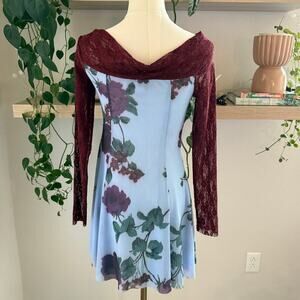 Kimchi Blue Y2K Sheer Floral Lace Mesh Mini Dress M Burgundy Purple Roses Grunge