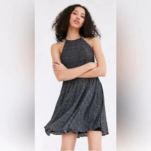 Black mini dress with white floral pattern from Kimchi Blue by Urban Outfitters. Smocked top. Fit and flare style. High neck. Adjustable spaghetti straps cross in the back. Open back. Size XS.