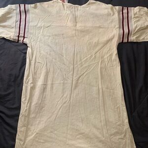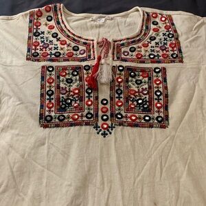 Chic cream top with vibrant red and black embroidery. Ideal for casual elegance.please check it’s a little stain on tunic any question feel freedom to txt thanks.