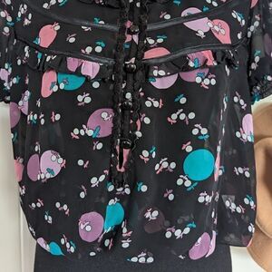 Description: Kimchi Blue Button Front Balloon Circle Print Top sz SM, classically femme details with lovely scallops trim along the neckline and front, satin detail on the front and back adds some depth, elastic waist, semi puff sleeve, flowy silhouette