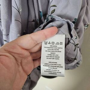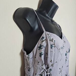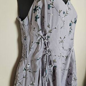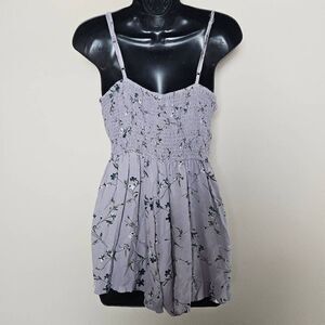 This is a light purple floral romper by Kimchi Blue. It has corset style laces on each side and smocking in the back. The straps are adjustable.