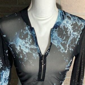Kimcine Curve - Sz S - high leg sexy bodysuit mesh with electric blue pattern