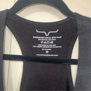Sleeveless racerback tank from Kimes Ranch. Black fabric with a leopard print logo detail across the chest. Breathable and lightweight for active wear. Simple, sporty silhouette.