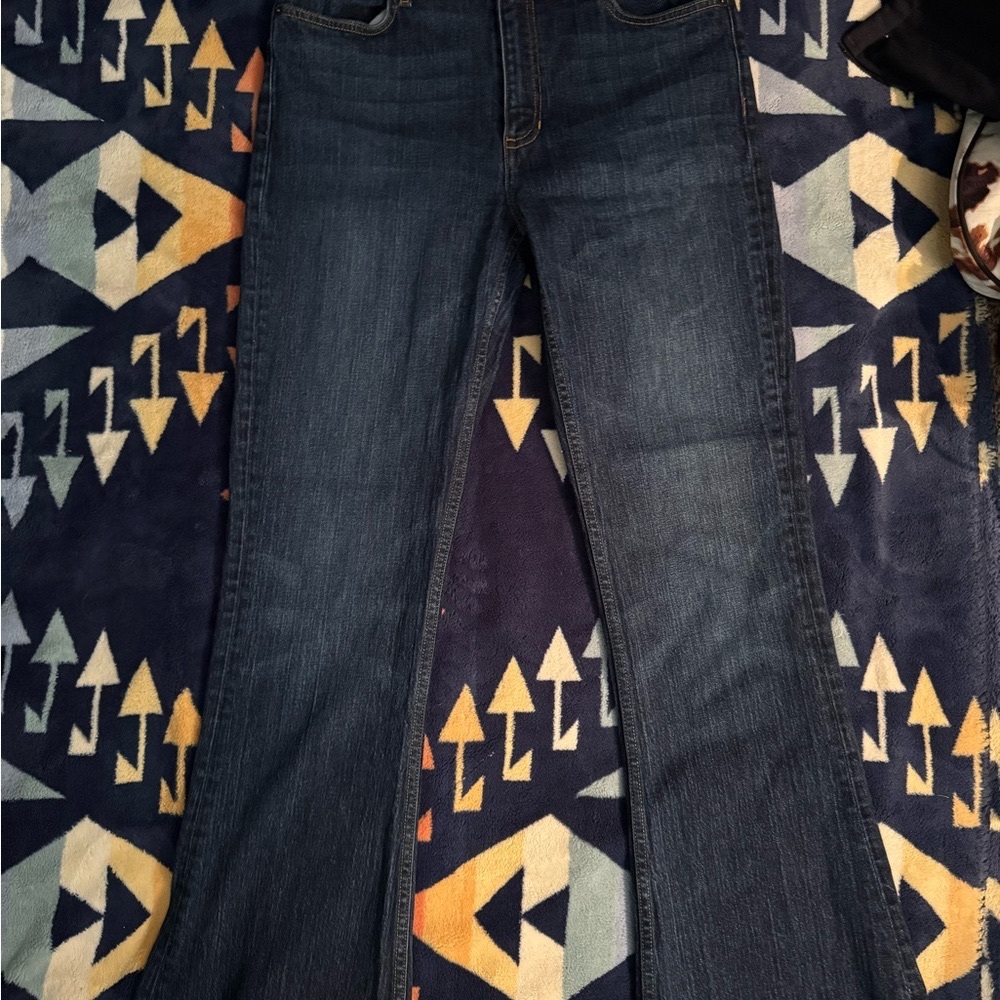 Stylish dark blue flare jeans by Kimes Ranch. Perfect blend of comfort and fashion.