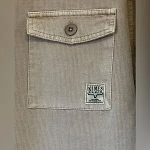 Casual tan shirt jacket with button front. Features dual chest pockets. Ideal for layering.
