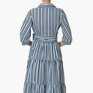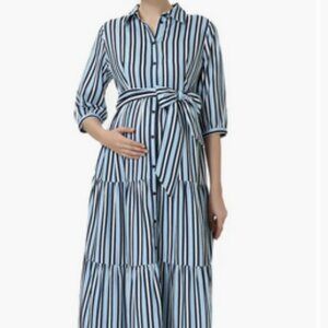 This Kimi and Kai maxi shirtdress is designed with vertical stripes. It features a front button closure, spread collar, and three-quarter sleeves with banded cuffs. It also has a waist tie and tiered skirt. The 56" length dress is crafted from 100% polyester and is unlined.