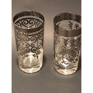 This vintage Kimiko highball glass is decorated with a thick platinum band at the top. There are 3 cartouches around the glass depicting a knight with a shield.The glasses stand 5 5/8" tall and are 2 3/4" across the top. They have a nice weighted bottom and are signed.