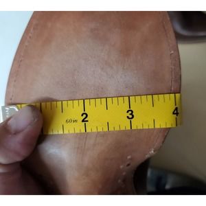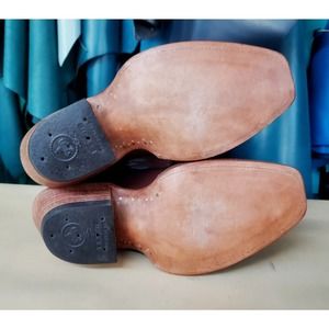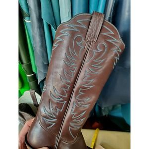This particular pair is gorgeous brown full calfskin with blue 3 row stitching and a natural heel, crafted for a customer that never picked them up. They measure to about a US Size 9-9.5 E width (wide). See pics for details and exact measurements.