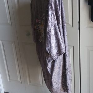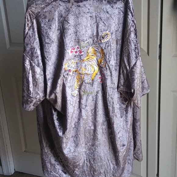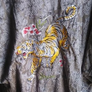 Grey silvery vintage burnout velvet kimmono with embroidered pouncing tiger on back. Mid sleeves. Excellent condition.