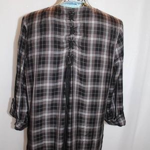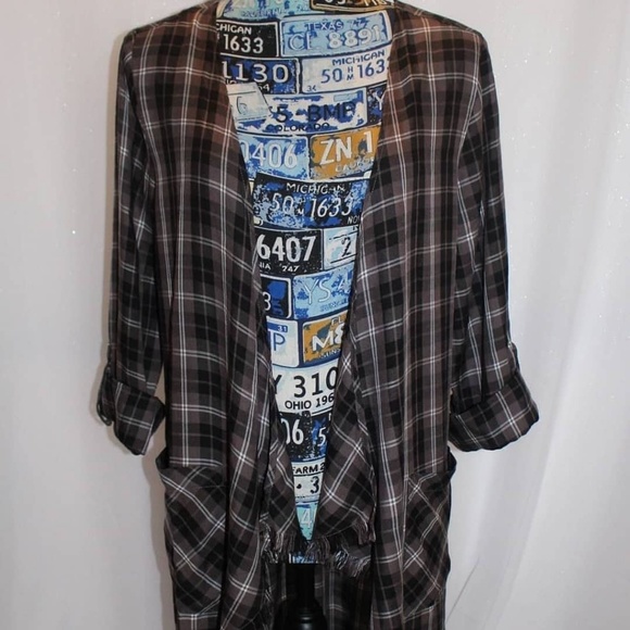 Billy T Plaid Kimono. There's a Lace-Up detail on the back and fringe around the hem. Black and grey plaid. NWOT