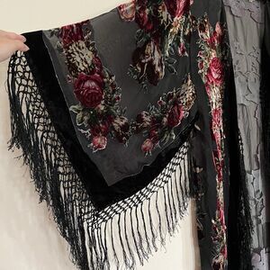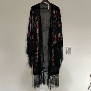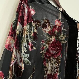 This Art to Classic Floral Velvet Burnout Kimono features a vintage-inspired design with a modern twist, perfect for women who appreciate bohemian style. The mid-length jacket is made of lightweight and breathable viscose fabric, adorned with floral patterns and fringe accents. The black color adds a classic touch to the piece, making it versatile for various occasions from casual outings to travel. Hand wash only to maintain the quality of the velvet fabric, and wear this stylish duster cover up in size L to elevate your wardrobe with a touch of artistry.