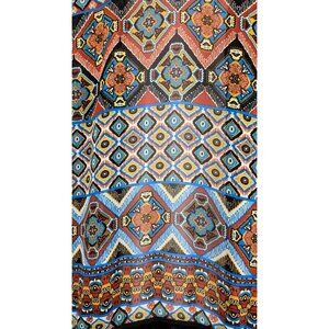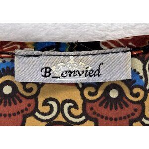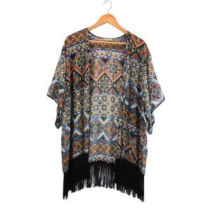 Floral and tribal pattern for this unique kimono wrap by B-envied. Semi-sheer fabric, three-quarter sleeves, open front with black fringe along hem. Very good condition.