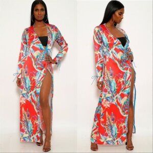 Asian fusion, floral print, wrapped satin kimono featured multi color print on a vibrant red background with high front slit & decorative trimming.