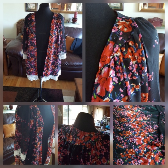 Sheer kimono type robe. Very beautiful pattern with black background. Two available in this color. Bust measurement is 54". It flares out to a total measurement at bottom of 57" around. The length is 35". It is absolutely new with original packing but did not have tags hen received.
