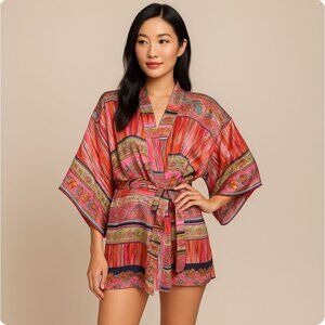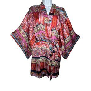 Kimono Robe Silky vibrant colors size Medium attached sash belt