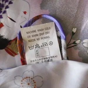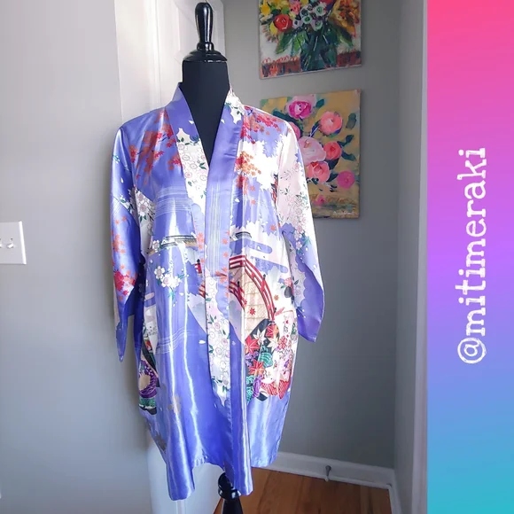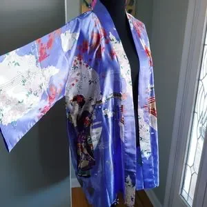This kimono style Japanese robe is absolutely gorgeous! The graphics on the fabric feature beautiful giesha girls with Japanese landscapes and architecture all around. This open-front, no sash kimono provides a flowy silhouette. It also has a side pocket. Although it has an intricate embroidered tag label, I could not place the brand. It appears to be handmade and sold in the Japanese street markets.
