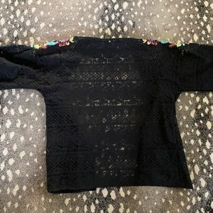 Incredibly versatile short sleeve lace open top with tons of super colorful embroidery and beads on a black lace background. I believe it comes from the Culture Clash Collection of 2010 which was somewhat Asian/Bohemian inspired. Perfect for spring and summer with 3/4 length sleeves, looks so much better in person than in pics. This would go with anything from sleeveless tee's to even a long sleeve tee underneath, but you decide. It is in preloved condition, like new as I keep all of my obsessive DDR in perfect condition! LOL