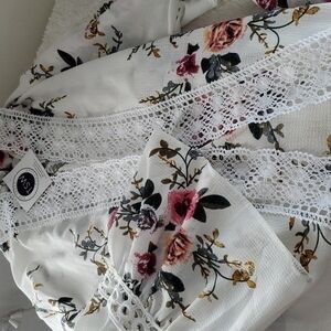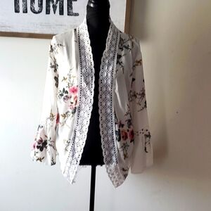 Flower Print Crochet Panel Bell Sleeve (light cardigam OR Kimono) Size One size fits most Light weight cardigan Weekend Vacation Flare Sleeve Polyester Floral NWTG A-3