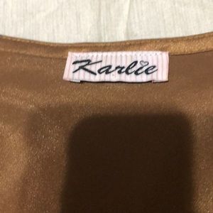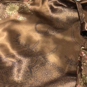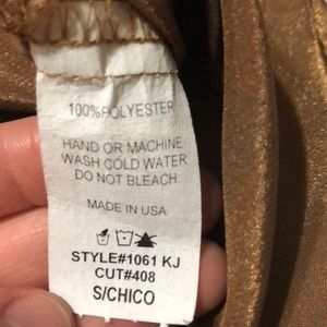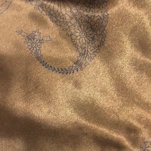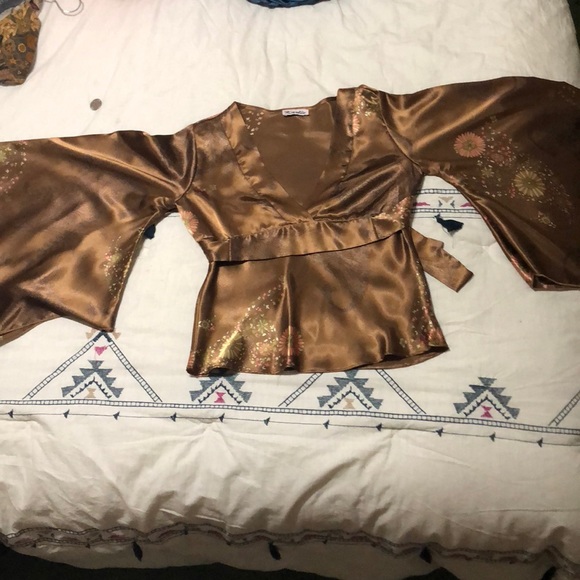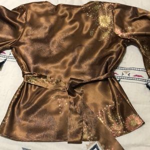 Gorgeous sheer gold kimono top. Fantastic condition and only worn once. The only imperfection I can see is in the last photo; there seems to be a little spot, but I’ll try to take that out before sending it. Other then that, it’s gorgeous super soft.