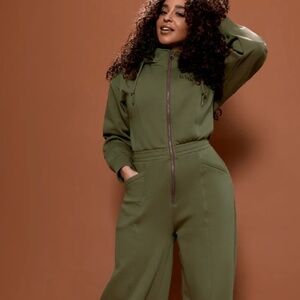 Long sleeve, wide-leg, full-length jumpsuit with zip front closure