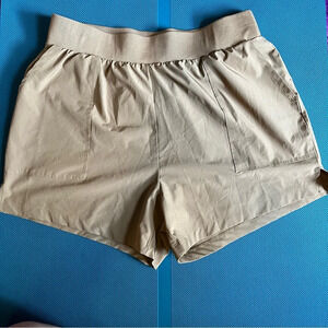 Kinesis activewear pull on shorts. It’s a darker khaki color. True color is the darker ones. Material is like a running short. Lightweight. Good for running. Has pockets.