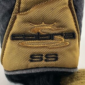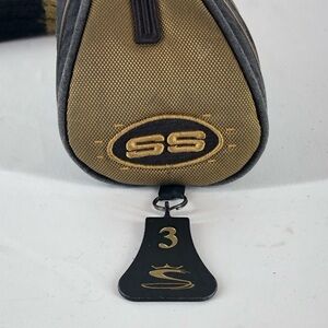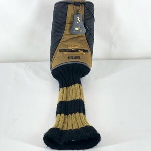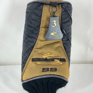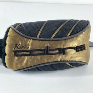 Protect your golf clubs with the stylish headcover. Featuring a sleek black and gold design, this headcover ensures your clubs stay safe and look great on the course. It is in good used condition.