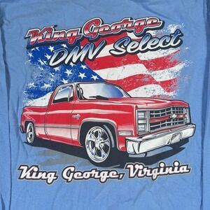 Keywords: long sleeve t shirt, graphic tee, truck shirt, King George, DMV Select, American flag, car shirt, men's shirt, casual wear, size M, Gildan, vintage style, automotive, Virginia
