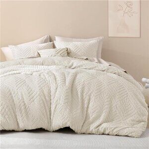 King Size Comforter Set Beige, 3 Pieces Cream Tufted Boho Farmhouse Bedding