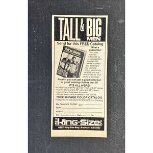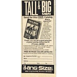 King Size "Tall & Big Men's Clothing "Free Catalog" Brookston, MA. Vintage Print Ad 1982 Car & Driver Magazine October 1982 About 3 x 5 Inches. Carefully shipped.