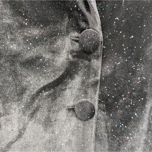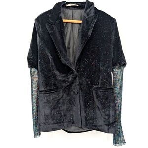 Add some sparkle to your wardrobe with this glamorous black velvet blazer! Featuring a shimmering fabric with multicolor glitter accents and eye-catching rhinestone-studded long sleeves, this statement piece is perfect for special occasions or adding a touch of drama to any outfit.