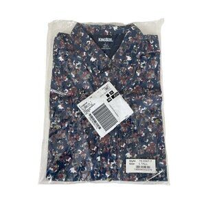 Kingsize men's casual button front short sleeve shirt. Shirt is dark blue and done in an abstract dark red and white skull print. It's made of a cotton blend and is a man's size LT or Large Tall. Shirt is brand new with tags. Has only been taken out of bag to photograph.