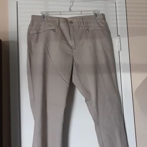 Taupe light weight denim pants waist band front and back elastic sides with belt loops. Zippered fly with one metal button closure.two front zippered pockets are usable. No back pockets. 29 inch inseam.