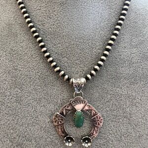 This distinctive Kingman turquoise Southwestern decorative sterling silver pendant, weighing 12.1g and measuring 2 inches in length, features a classic Naja design, a prominent symbol in Native American jewelry. The sterling silver setting showcases intricate hand-stamped details and traditional Southwestern motifs, including stylized floral or sunburst patterns adorning the curved arms and base of the Naja. At its heart, a vibrant Kingman turquoise cabochon, set in a serrated bezel, provides a striking focal point with its characteristic green hue and natural matrix. The pendant is completed with a sturdy bail at the top, allowing it to be worn with a variety of chains or necklaces, such as Navajo pearls, as suggested by similar items.