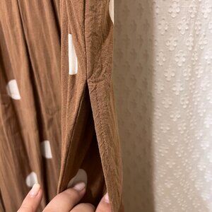 Indulge in timeless elegance, reminiscent of the chic sophistication found in Anthropologie designs. This dress exudes vintage-inspired charm with its playful polka-dot pattern, while the faux-wrap silhouette offers a flattering fit that accentuates curves beautifully. Crafted with attention to detail, this dress features delicate ruffle accents and a tasteful neckline that adds a touch of femininity. Perfect for both casual outings and special occasions, this dress effortlessly combines style and comfort for a look that's as effortless as it is chic. Elevate your wardrobe with the classic charm of our faux-wrap tan polka-dot dress, a timeless piece that's sure to turn heads wherever you go.