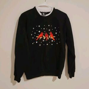 Get into the Christmas spirit with this festive Kings Universal Cardinal Sweater. The sweater features a crew neckline, long sleeves, and a comfortable regular fit. It is made of a soft and cozy blend of polyester and cotton with a tight-knit fabric type. The sweater is adorned with rhinestone and embroidered accents that add a touch of sparkle to your holiday wardrobe.