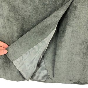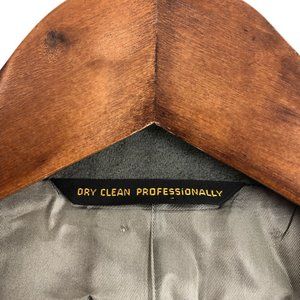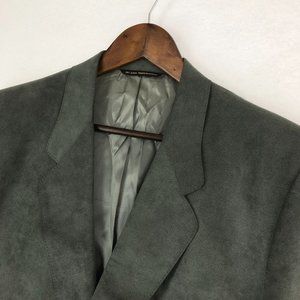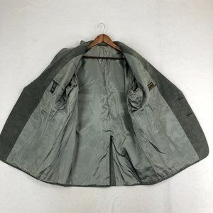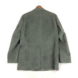 Men's vintage gray suede** western style blazer jacket, sport coat. Single breasted, two-button front closure, long sleeves with button cuffs and shoulder pads. Collared neckline, notch lapels, vented back hem. Front patch pockets.