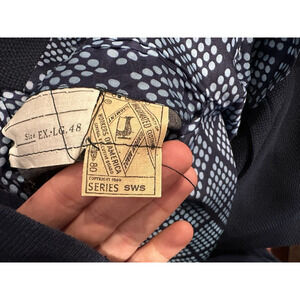 On sale is a Kingsridge Navy Blue Knit Jacket Size 48. They have some small marks on the front (pictured). The jacket is in overall good, used condition.